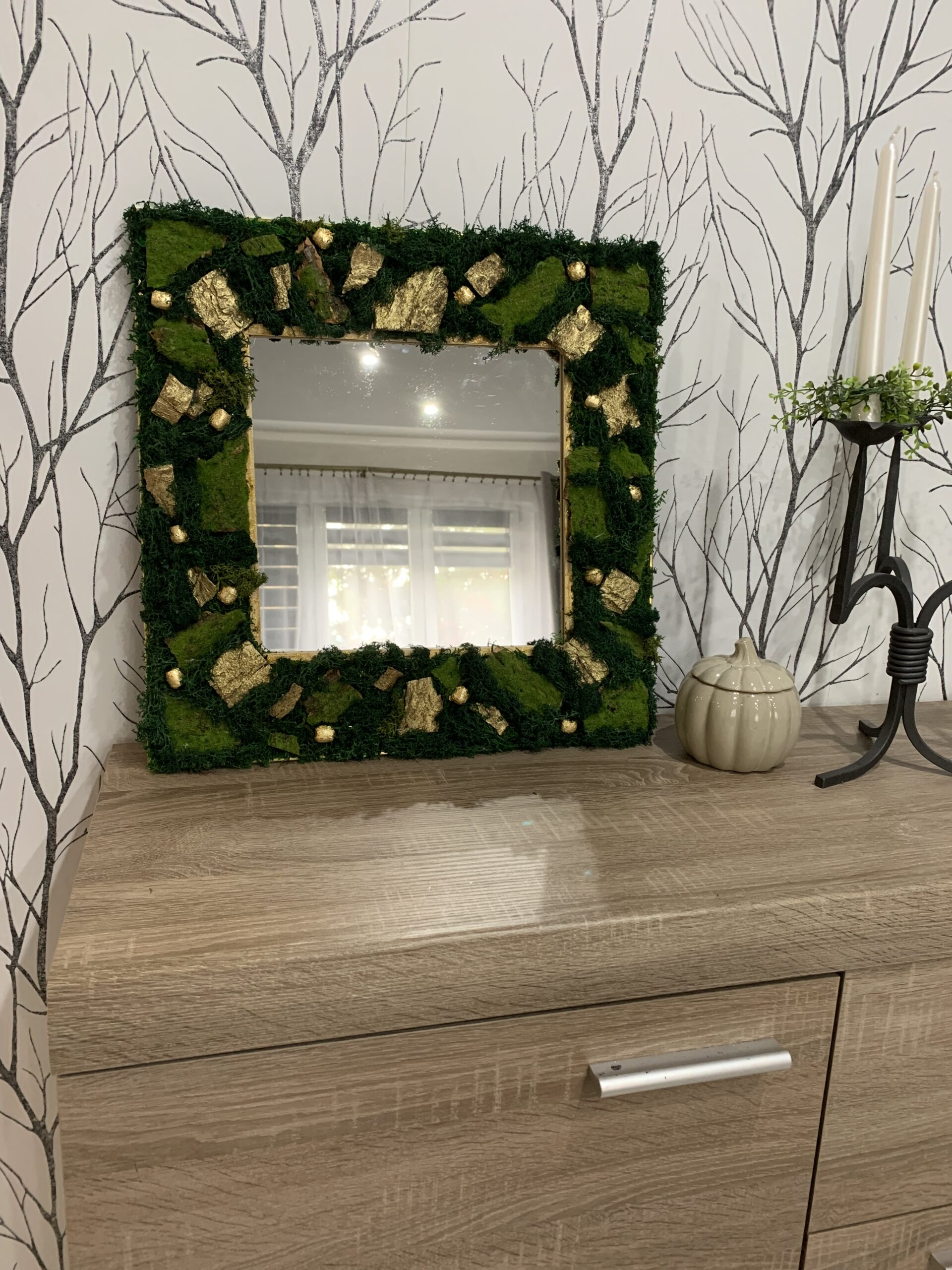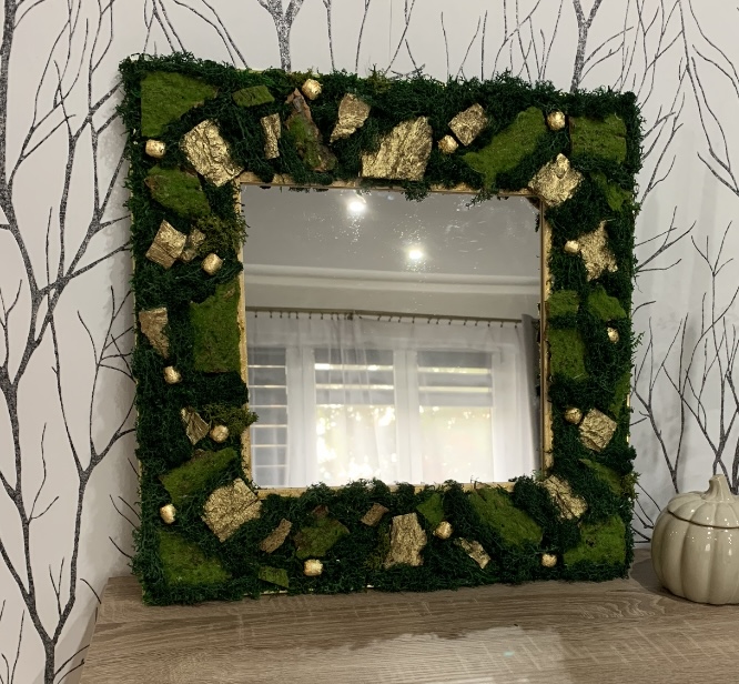 Machové zrkadlo je ručne robené, vhodné do Vášho interiéru. Je vyrobený zo stabilizovaného a sušeného machu a pozlátenej kôry, bezúdržbová starostlivosť. Dodajte Vášmu domu alebo chate kus prírody.